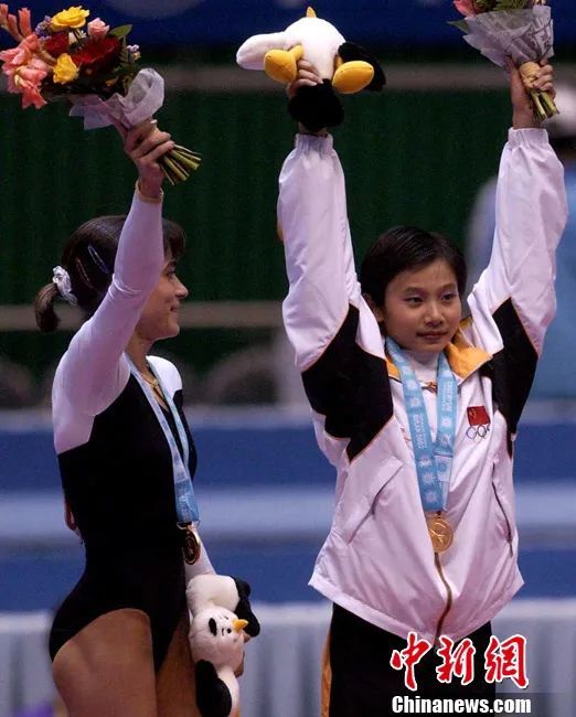 资料图:图为2002年10月5日,乌兹比克斯坦体操老将丘索维金娜在釜山亚运会女子自由体操比赛中动作稳健而获得金牌,与中国小将张楠并列冠军。中新社发 贾国荣 摄