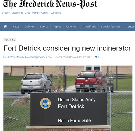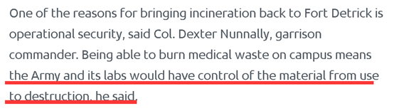 直到2020年1月21日左右,新冠疫情已经开始在中国武汉爆发之时,德特里克堡的相关负责人才在接受当地媒体采访时提出他们打算重新修建一个焚化炉,重新在德特里克堡处理医用废品,以便军方可以“控制”这一流程。