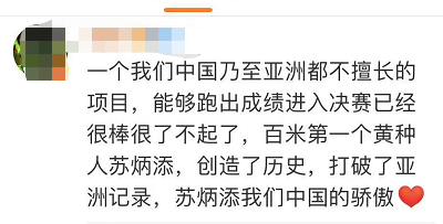 一天前的小组赛第一枪里,炳添跑出了10秒05的成绩,以小组第二的身份挺进半决赛。而在这场比赛里,苏炳添在最后30米直接放慢速度,“转头”观察身旁对手的名场面,也被网友们奉为佳话。