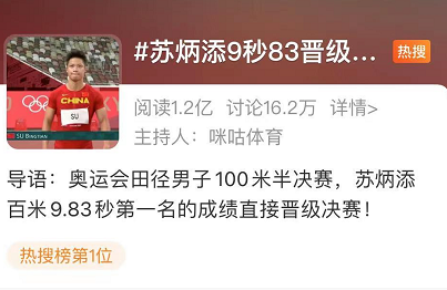 8月1日,在东京奥运会男子100米半决赛中,苏炳添跑出9秒83,创造了新的亚洲纪录!苏炳添小组排名第一进入决赛,创造历史,成为中国首位闯入奥运男子百米决赛的运动员。