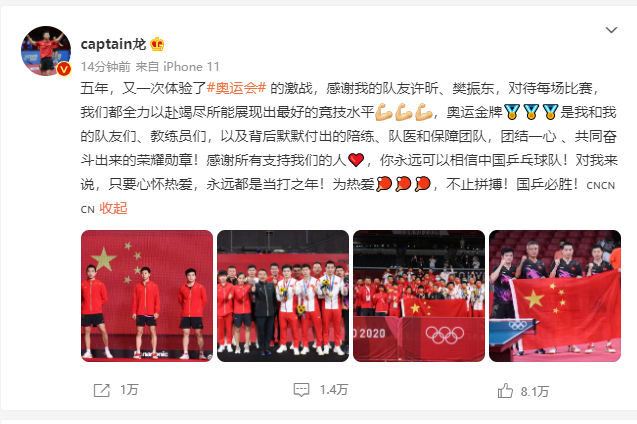 马龙在微博上发文称:五年,又一次体验了奥运会的激战,感谢我的队友许昕、樊振东,对待每场比赛,我们都全力以赴竭尽所能展现出最好的竞技水平,奥运金牌是我和我的队友们、教练员们,以及背后默默付出的陪练、队医和保障团队,团结一心 、共同奋斗出来的荣耀勋章!感谢所有支持我们的人,你永远可以相信中国乒乓球队!对我来说,只要心怀热爱,永远都是当打之年!为热爱,不止拼搏!国乒必胜!