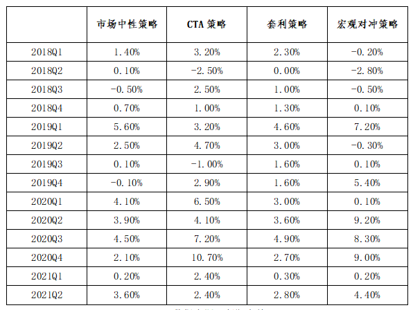 除此之外,还包括股票多空策略、管理期货策略、统计套利策略、宏观对冲策略等。其中,股票多空是指同时持有股票多头与空头进行风险对冲的投资策略,做多低估股票,做空高估股票;量化对冲类的管理期货策略,多侧重于期货市场投资,从不同期货市场或是同一市场内不同期货合约间的价差中寻求利润;统计套利多属于中频交易,是通过分析价格模式和价格差异,以产生 alpha为最终目的交易策略;宏观对冲策略关注长周期上的alpha来源,是基于宏观经济周期理论,对不同大类或地区资产进行轮动配置的对冲策略。