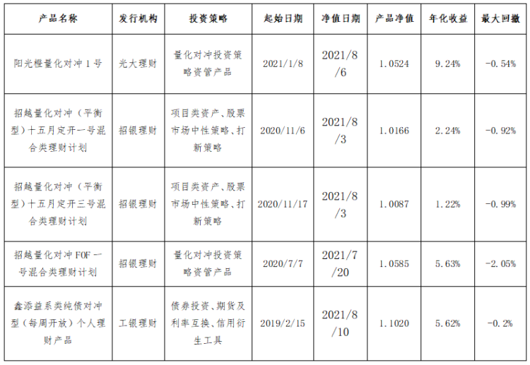 在中国财富管理网筛选理财子公司公开发行的理财产品,名称中包含“对冲”字样的理财产品有5只,分别是光大理财发行的阳光橙对冲1号、招银理财发行的招越量化对冲(平衡型)十五月定开一号混合类理财计划、招越量化对冲(平衡型)十五月定开三号混合类理财计划、招越量化对冲FOF一号混合类理财计划以及工银理财发行的鑫添益系类纯债对冲型(每周开放)个人理财产品。