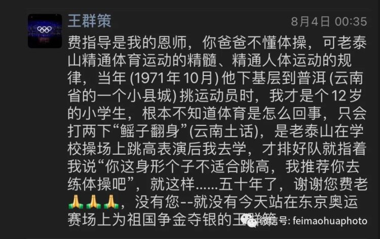 在我写这篇文章的时候,回忆起这个瞬间,我忍不住热泪盈眶。我想起了我的爸爸:他只是一个普普通通的省队跳高教练,他培养的运动员最好成绩只是拿过全国比赛的第二名,甚至没有资格晋级奥运会。但他在自己的职业生涯中兢兢业业地为中国的体育事业而努力。我想,如果他知道他当年推荐的运动员最终成为了奥运体操的金牌教练,他一定会非常、非常开心。