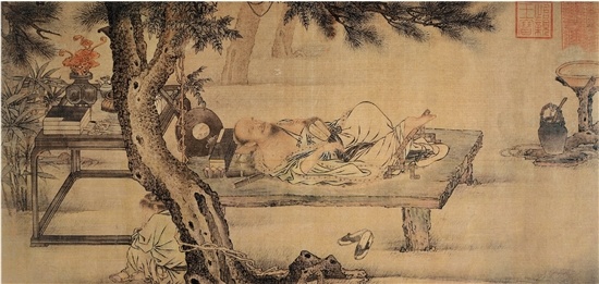 汲古阁曹友今购得高江村著录宋刘松年《梦蝶图》绢本横看,上有怡亲王、式古堂、安仪周等图记。一老人酣睡松下石抬上,童仆倦卧松根,意态闲适,笔墨精妙。签题“宋刘松年《梦蝶销夏图》”,犹是江村手笔。盖当时《梦蝶》《销夏》属两图。此乃《梦蝶》一幅,已为后人裂为两卷。《销夏》一图尝见于张葱玉处,尺寸与此相同,而下角有“毌道”二字隐石隙,为湖师昔年所发见,定为刘毌道而非刘松年。此幅无款而尺寸相同,笔墨亦相似,其为毌道无疑矣。 ——王季迁《题画杂录》