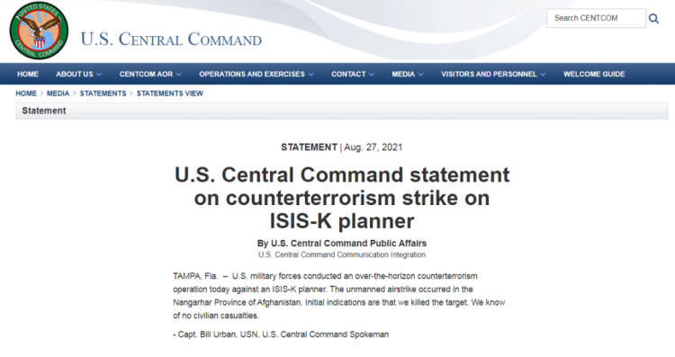 当地时间8月27日,美国军方发布的一份声明称,美国军方对参与策划在喀布尔对美军发动袭击的极端组织“伊斯兰国”的一名成员实施了无人机打击。