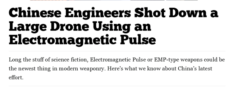 该报道引用香港《南华早报》的描述称,中国公开发表的一篇论文显示,中国工程师使用一种新型电磁脉冲(EMP)武器击落一架大型无人机,这可能是中国首次公开的对EMP武器的实际测试。