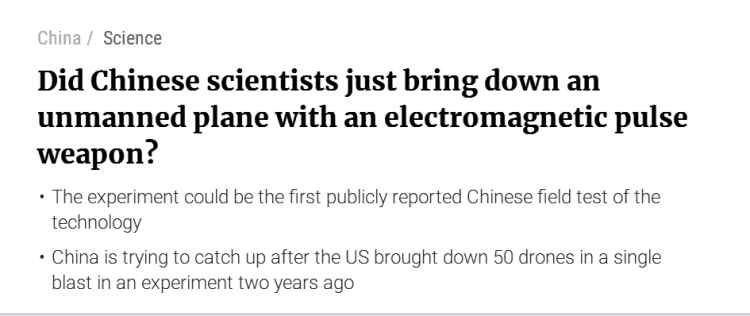 “这可能是中国首次公开承认,利用强大的电磁脉冲武器击落一架大型无人机”。