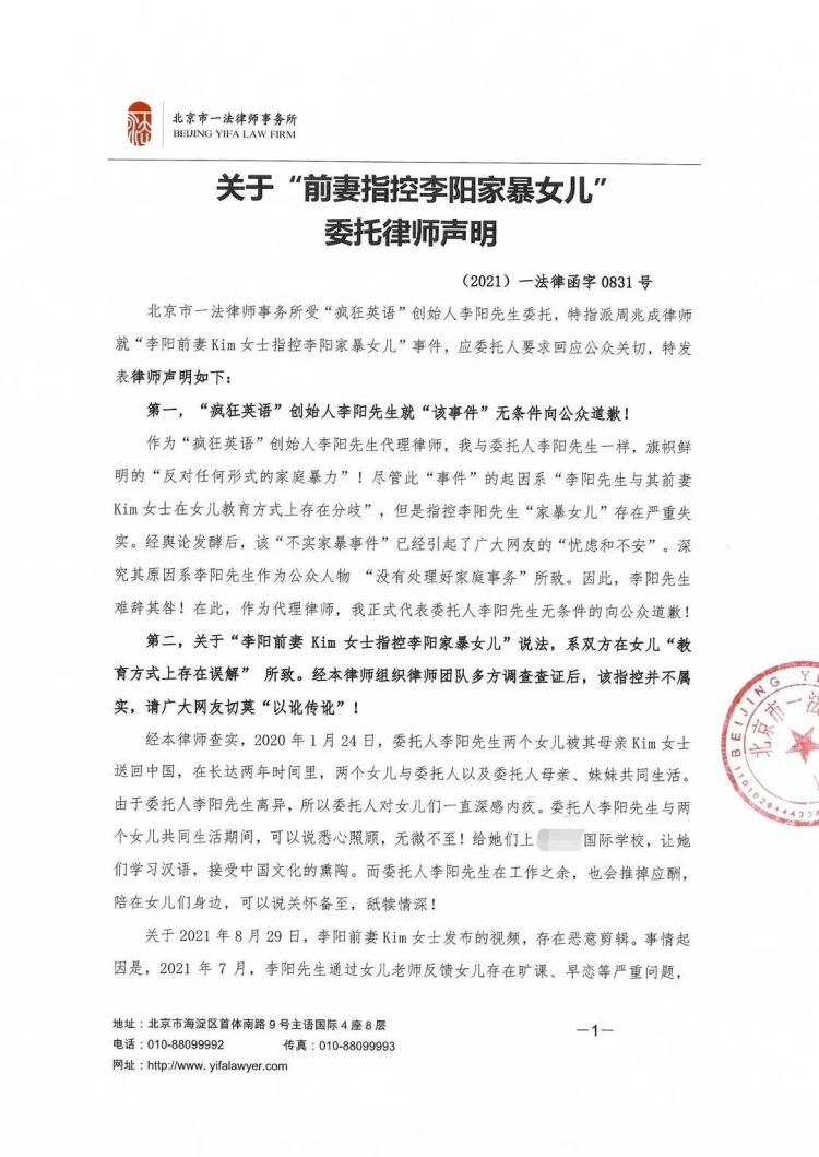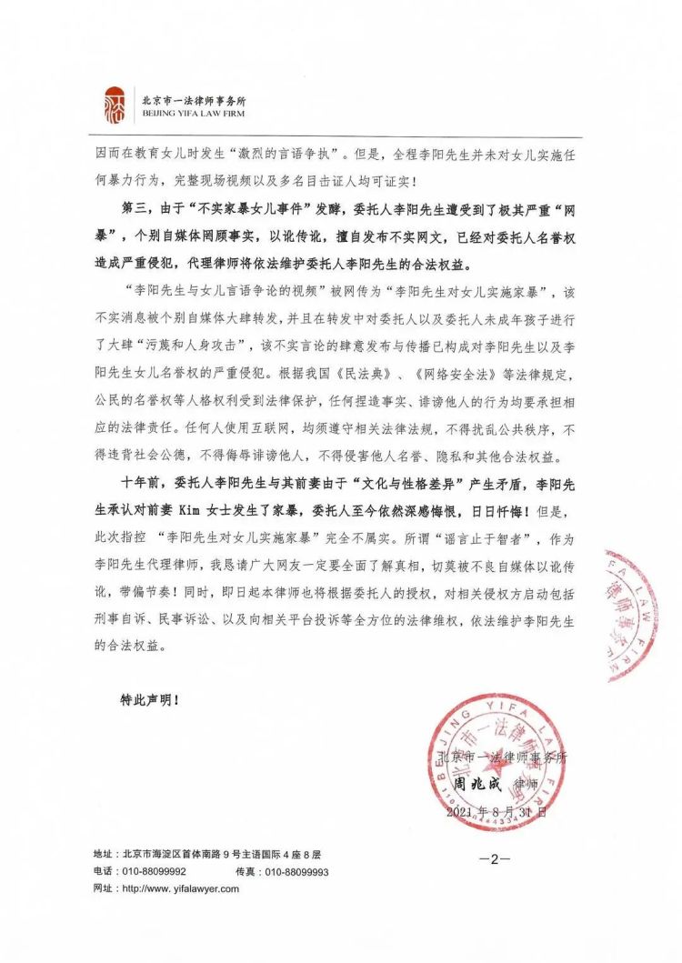 8月31日,李阳通过律师声明对“家暴指控”进行否认,认为此事的起因,系“李阳与其前妻Kim女士在女儿教育方式上存在分歧”。