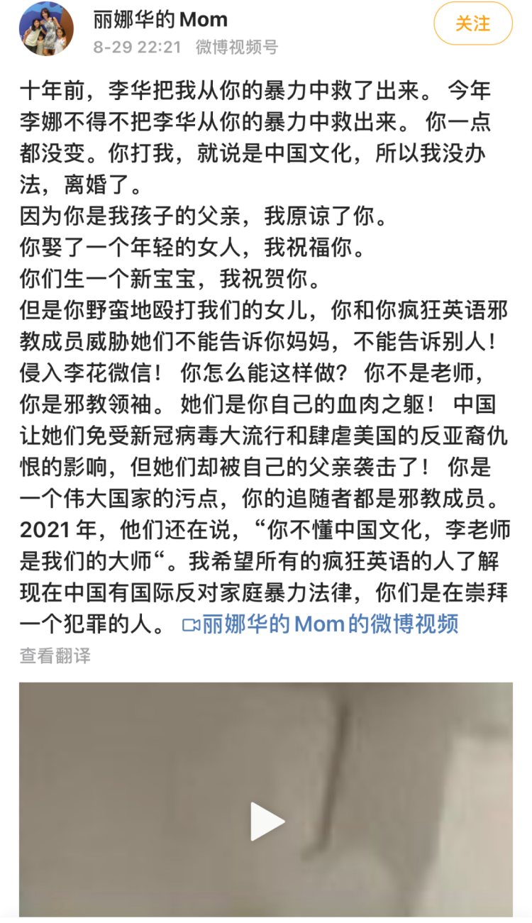 8月29日,“疯狂英语”创始人李阳的前妻Kim在微博上发布视频,指控李阳在离婚又再婚后,继续家暴,野蛮殴打女儿。
