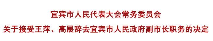 根据王萍本人、高展本人提出辞去宜宾市人民政府副市长职务的请求,宜宾市第五届人民代表大会常务委员会第四十五次会议决定:接受王萍、高展辞去宜宾市人民政府副市长职务,报宜宾市第五届人民代表大会第六次会议备案。