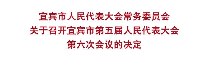 宜宾市第五届人民代表大会常务委员会第四十五次会议决定:宜宾市第五届人民代表大会第六次会议于2021年9月7日在宜宾市叙州区召开,会期预计两天。
