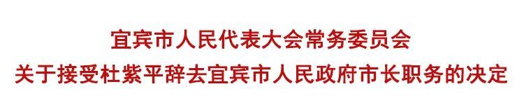 根据杜紫平本人提出辞去宜宾市人民政府市长职务的请求,宜宾市第五届人民代表大会常务委员会第四十五次会议决定:接受杜紫平辞去宜宾市人民政府市长职务,报宜宾市第五届人民代表大会第六次会议备案。