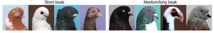 研究人员培育了两只长着短喙和中等喙的鸽子--中等喙的雄性鸽子是Racing Homer,这种鸟的繁殖速度快,喙的长度跟原始岩鸽相似。这种小喙的雌性是一种Old German Owl--一种奇特的鸽子品种,其拥有一个小而矮胖的嘴。