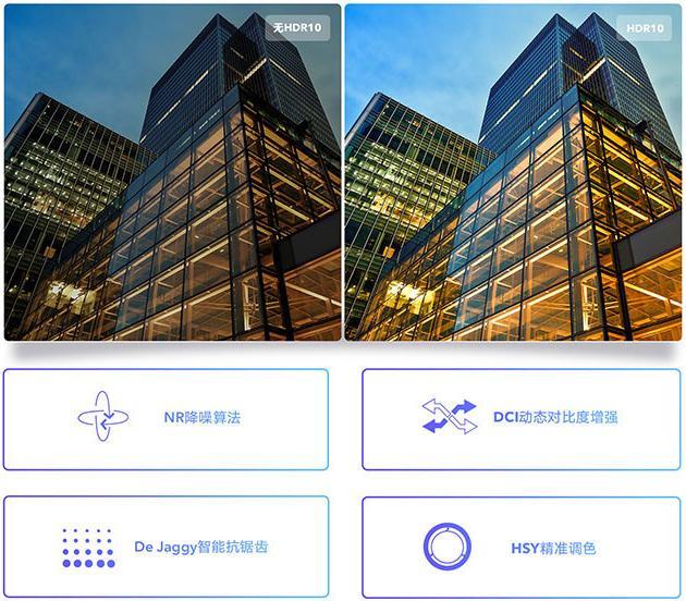 其独特的魔法画质引擎可以带来更高层次的画质解析,实现HDR10高动态解码能力,在增强视频动态对比度、强化高光、暗场区域表现力上更加得心应手,看电影更有临场感。NR降噪算法画质引擎,配合DCI动态对比度画质引擎,通过对不同画面的时域、空域智能分析,可以实现全局和像素级别动态范围调节,从而大大消除高压缩比视频上很容易出现的噪点,既能提高亮度、对比度,也可以最大限度地提升画面清晰度。