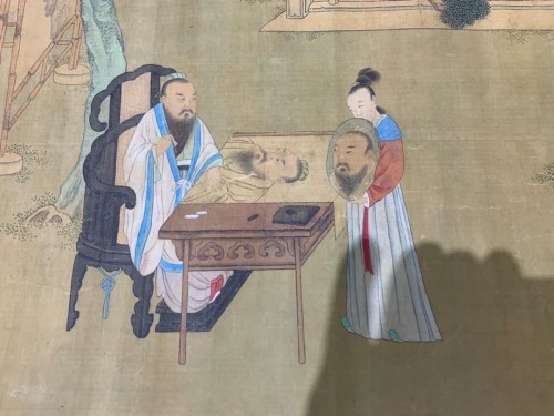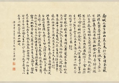 文衡山的作品刚才我已经看了,有这么一个长卷,我觉得在座的有钱人应该关注一下文衡山,因为在拍卖场上久经沙场的老将或是新手都觉得:文衡山没有受到更大的关注,卖的还便宜。这件作品这么开门,写得这么放松,据说也没有花了大价钱,就是说收藏者捡了一个大便宜,所以我建议你们大家都去捡便宜。看完这次丘挺的画展以后,你们能够从他那里领悟一点艺术的境界品味,再到拍卖场上拣些文衡山这样的“大便宜”,我觉得这一场雅集可能大家都会心花怒放。