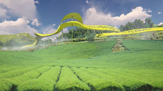 通过调研,从当地文旅发展的痛点出发进行设计,“这里的优势是离城市近,痛点也是离城市近。游客没有合适的空间角度去近距离接触茶园,看一眼就迅速走了,没有形成消费。”有了“幸福的黄飘带”,游客可以在这里拍照、发朋友圈、散步、游玩,增加了游客停留的时长和粘度,也为乡村餐饮、民宿提供了发展空间。