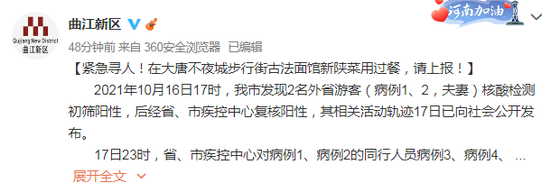 经核查,病例1、2于10月16日11时34分扫码进入大唐不夜城步行街古法面馆新陕菜用餐,按照新冠肺炎疫情防控要求,现急寻10月16日11:30-24:00,在大唐不夜城步行街古法面馆新陕菜有活动轨迹的人员。