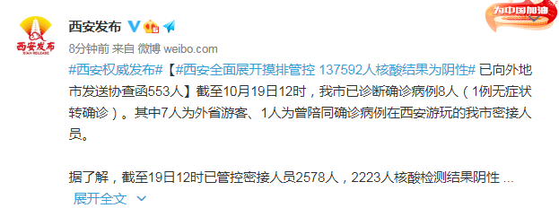 截至10月19日12时,我市已诊断确诊病例8人(1例无症状转确诊)。其中7人为外省游客、1人为曾陪同确诊病例在西安游玩的我市密接人员。