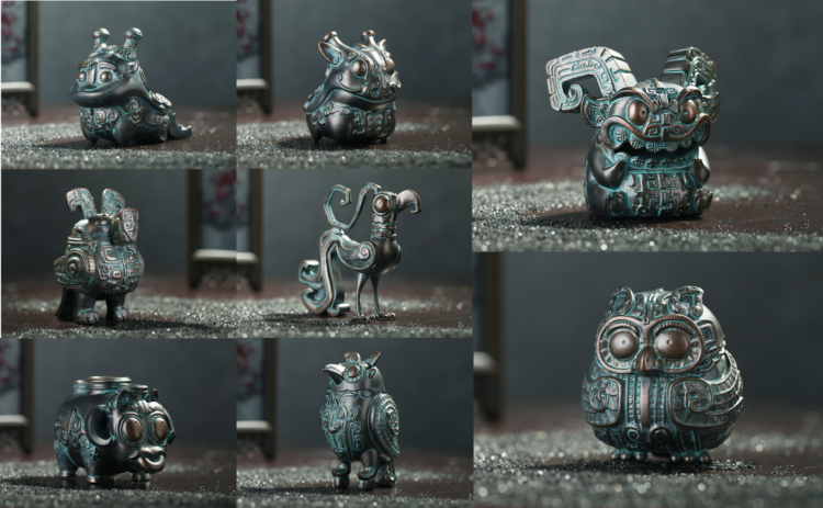 其中,《青铜小分队》在融合中国文化的方式上与《仕女日常》有异曲同工之处,它提取了商、周时期青铜器中常见的造型及纹样为设计基础,创作出以“鸮”、“饕餮”、“觥大”、“觥二”、“冷鸮”、“牺尊”、“凤鸟”为形象的可爱造型,古代器皿的质感融合卡通造型造成的反差感,同样诙谐有趣,更加接近现代人的趣味性和可玩性。