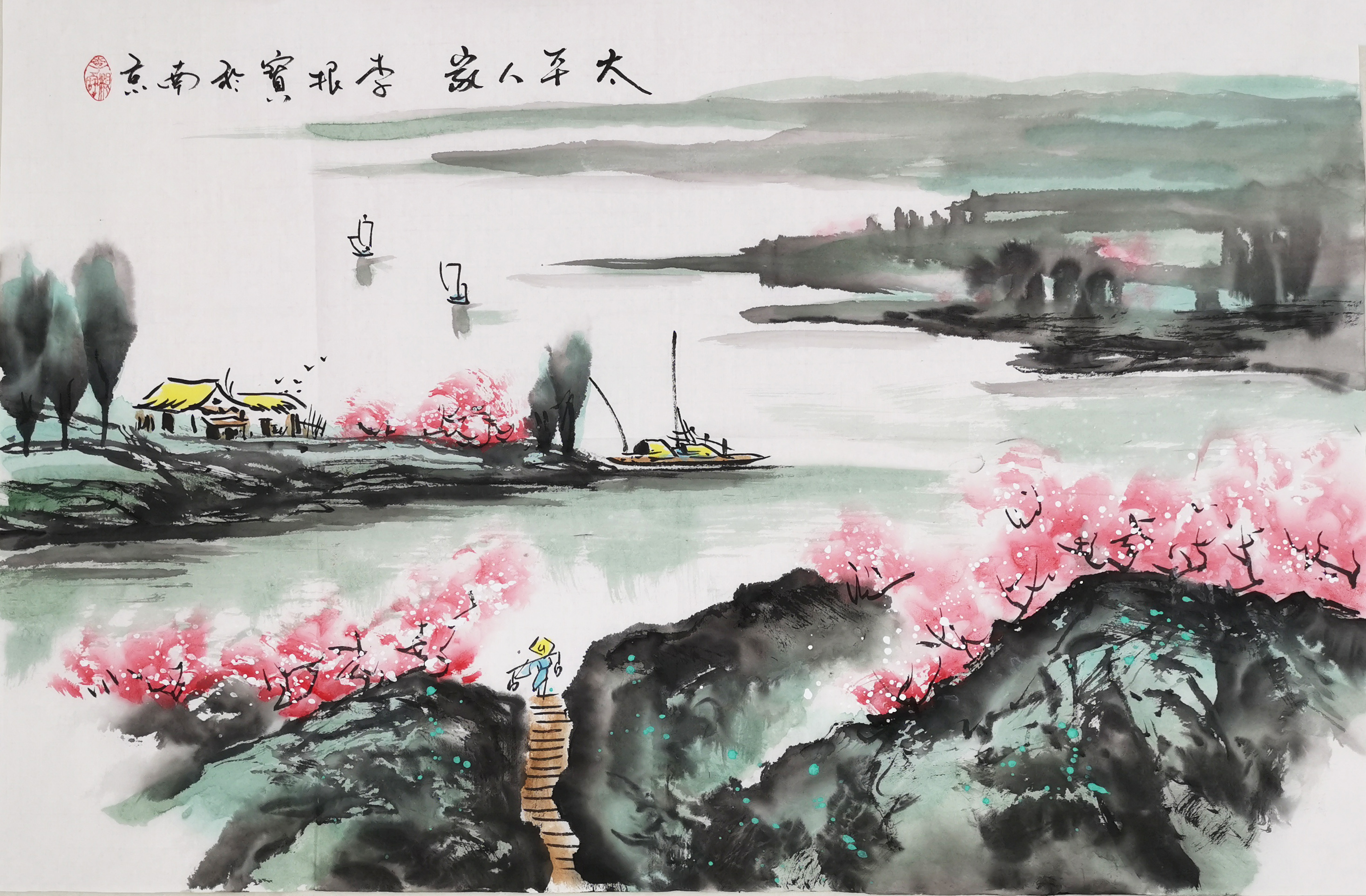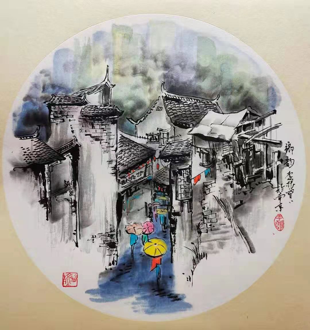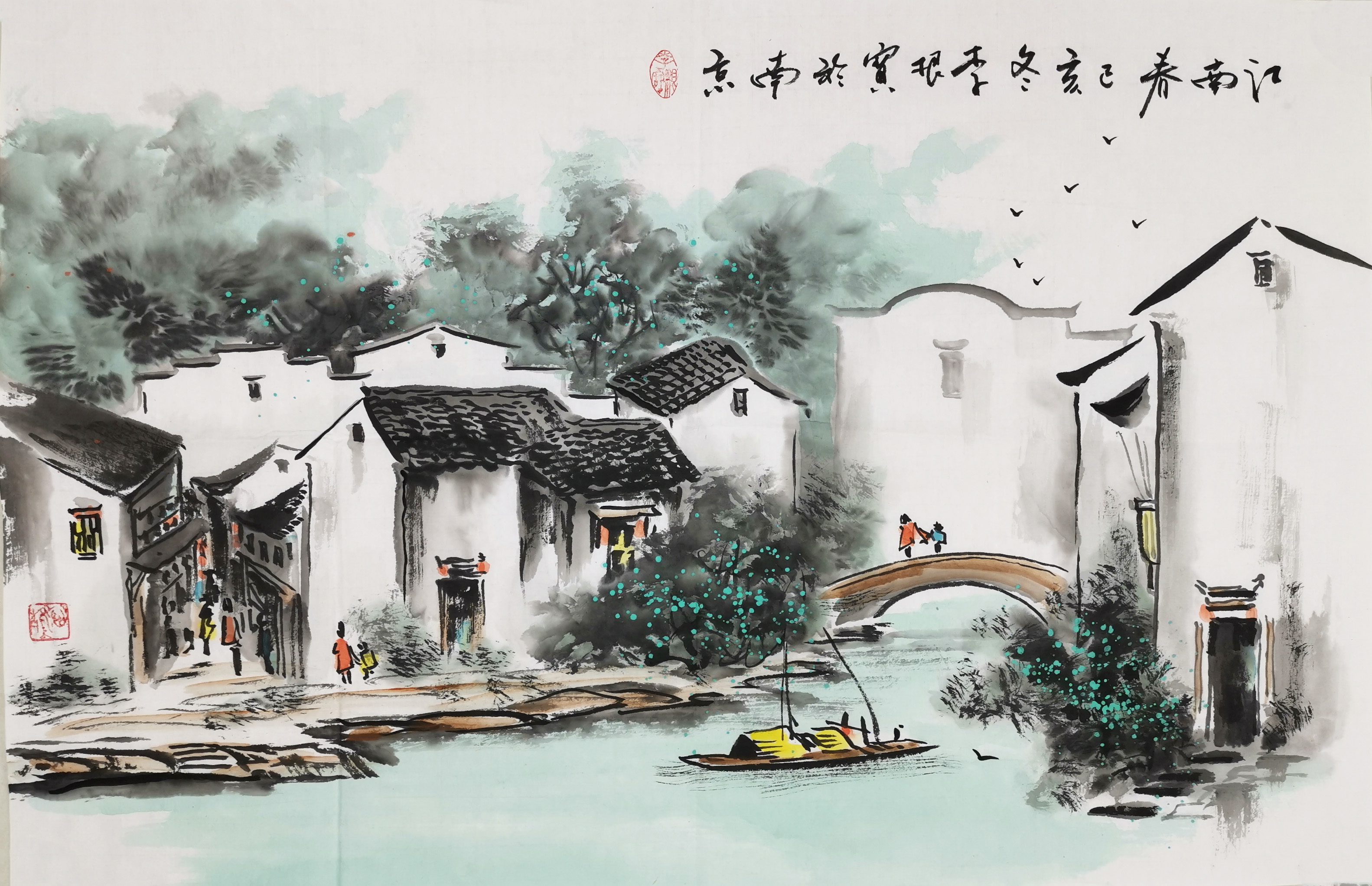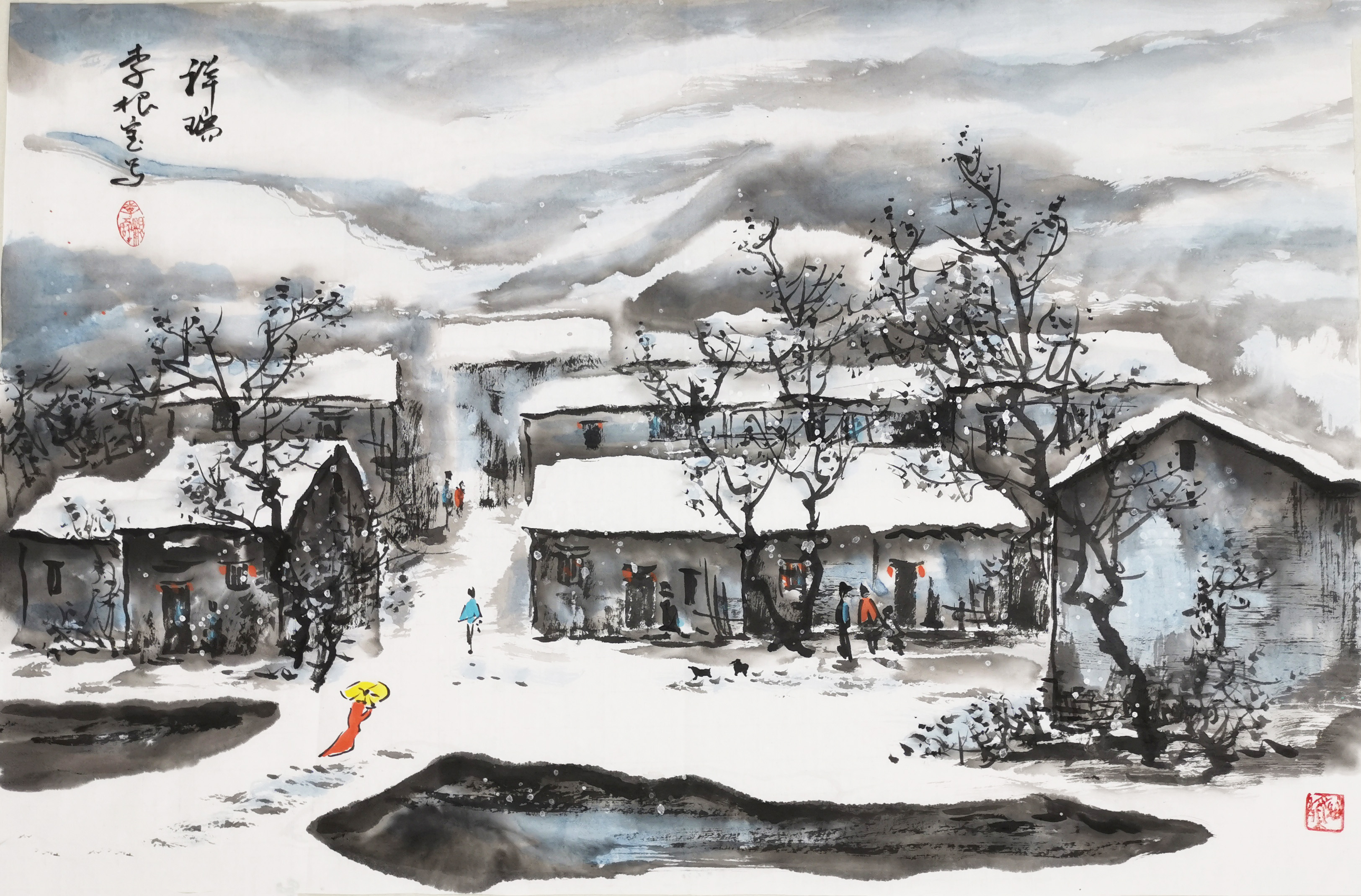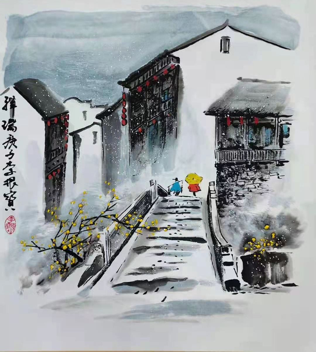 除了水墨山水画,李根宝的江南水乡系列同样撼人心魄。他画的水乡小品构图深远,表达出咫尺千里的奇效。密而有疏,实而有虚,三者纵横穿插布局,使得画面生动,情景交融。