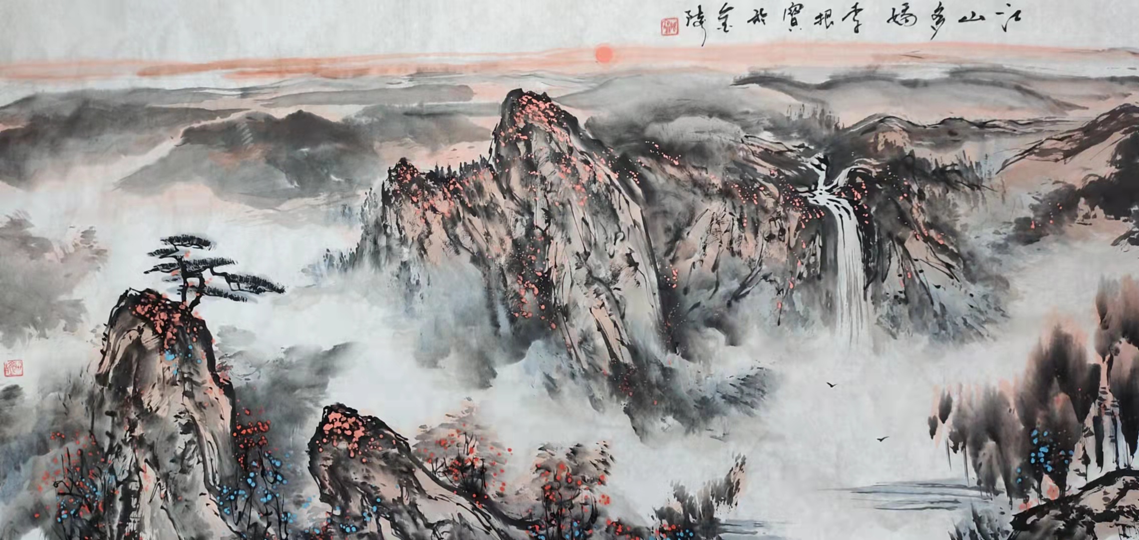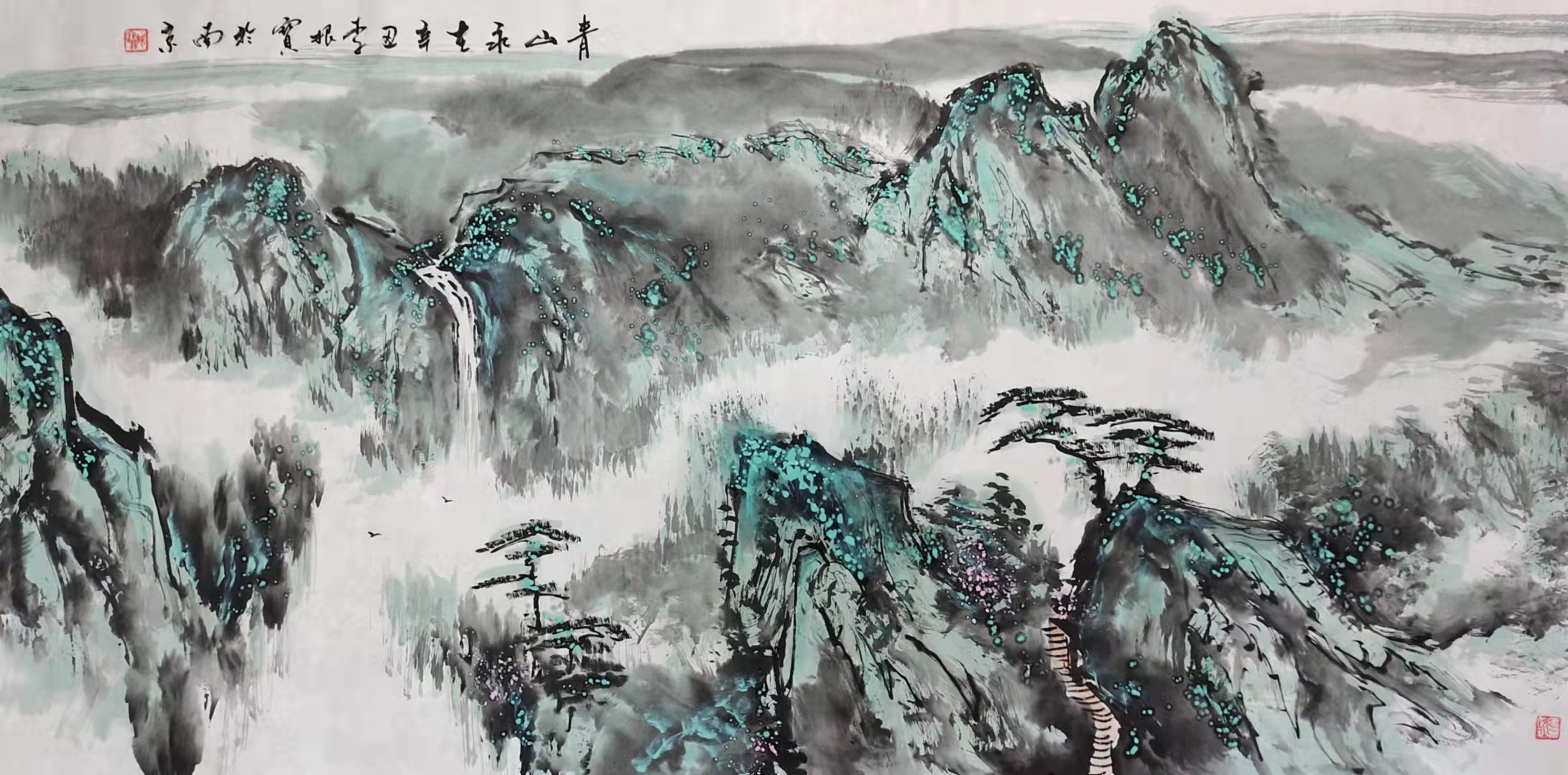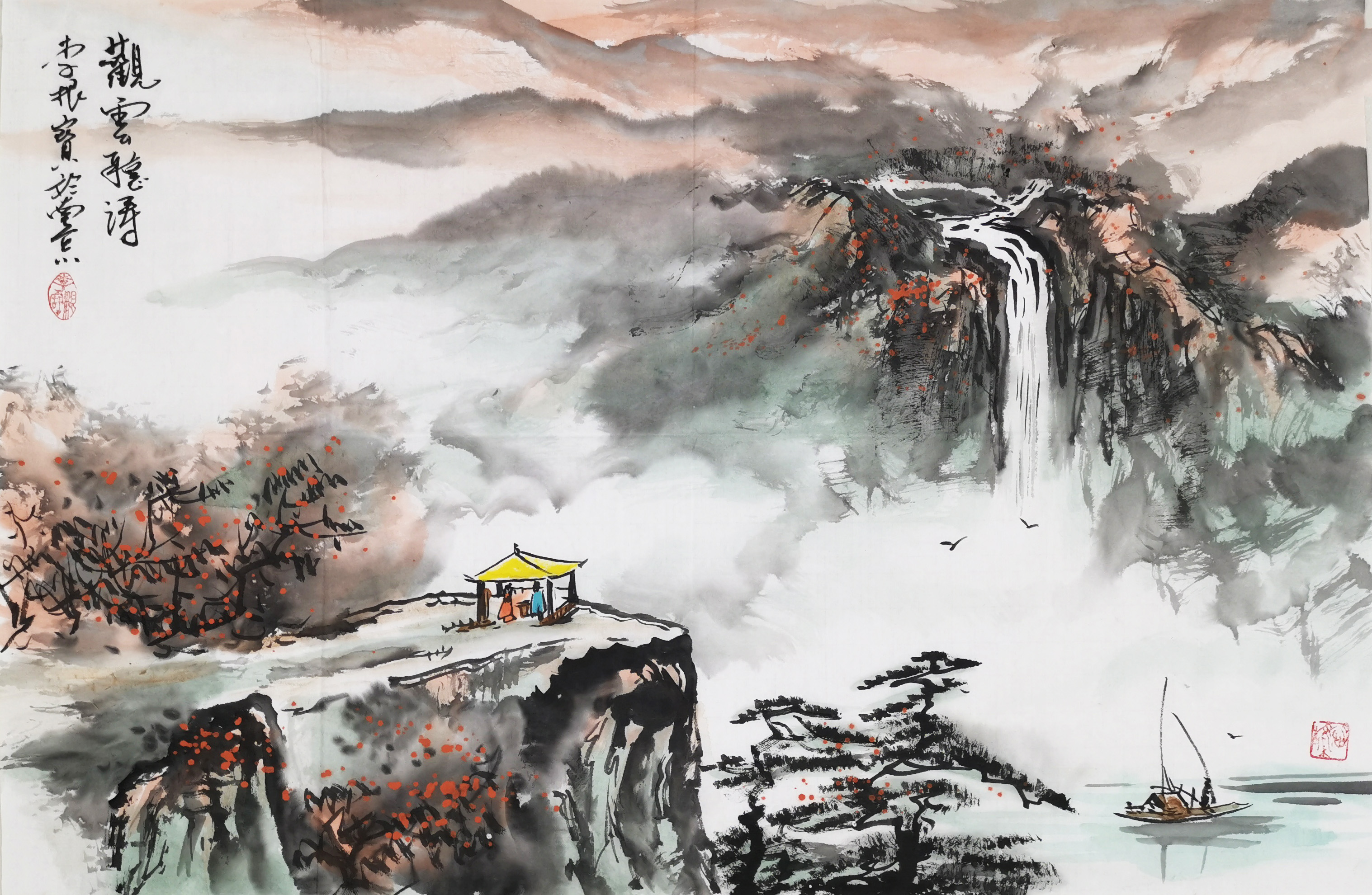 细观他的水墨山水,线条疏秀流畅,刚柔相济,墨色浓淡相间,多用湿墨晕染,既有雄秀跌宕之概,更具蓊郁淋漓的气象。时用留白、墨块之法,使得画面上云蒸雾霭,变幻无穷。通幅山高气远,飞泉急湍。草木华滋,坡石秀逸。仿佛可以临风听泉,可以俯瞰夏荫秋毛、云蒸霞蔚。更多以点染晕出苍润、奇崛的风格。远山则多用淡墨晕染,或水破墨出朦胧、氤氲的奇效。