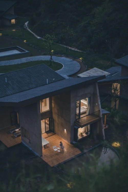 师傅的山,共有八栋独立小院,围绕中央绿地广场依次排开,背倚苍山,面面相望。老子言:无即是有。院子在设计结构上简单而克制,实现了为空间“留白”,最终与自然形成了一种曼妙的和谐。延续了隐居乡里一贯的设计理念——因地制宜、尊崇自然。场地的特殊性使得整体设计建筑依附于山体,与山围合成院,在充分保留鄂西北民居风貌的基础上,加以适度改良,朴拙的色调,简单克制的骨感外形,与山野自然相融,最终打造出一个气韵生动,与自然、人文对话的诗意空间。