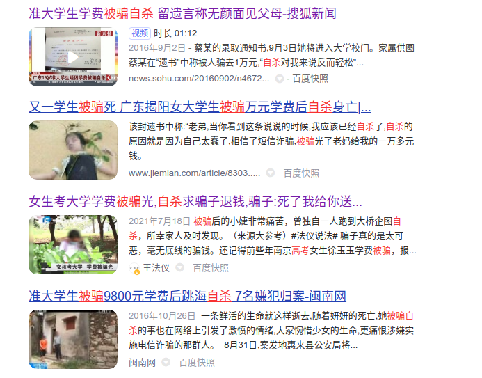 更不能忘记,国内已发生多起学生被骗后自杀死亡的悲剧。