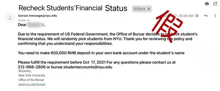 可昨前天孩子又来要钱,说接到学校邮件,要求在账户里加存一笔钱,以证明学生自身经济状况。家长这次起了疑心,因为从未听说美国学校还有这样的要求,要求孩子把学校邮件转来看看。没过多久,孩子还真把学校邮件的截图发过来了。