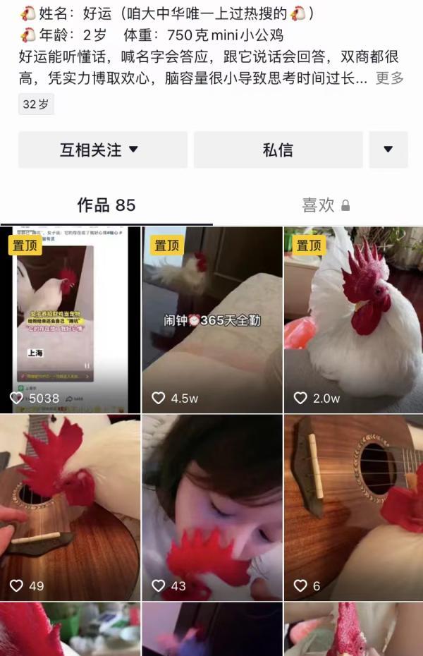 相对于常见的公鸡,“好运”只有鸽子般大小的身型,体重750克,尾巴犹如凤凰羽翼,模样俊美可人。“‘好运’刚被带回家时,还被关在笼子里养,但随着每天的朝夕相处,越来越亲密,我看到了它可爱的一面,和它在一起,我感受到了无限的快乐,它也带我打开了一扇新世界的大门,让我对鸡有了新的认知。”她说,“好运”缓解了自己的抑郁症。她每天都在抖音号里记录她和“好运”的生活点滴,还上了热搜。