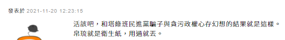 还有人称,“活该吧,和民进党骗子与贪污政权心存幻想的结果就是这样。帕劳就是卫生纸,用过就丢。”“这个国家(指帕劳)很奇怪,是只有台湾观光客可以宰吗?就没人要去,也不行?”
