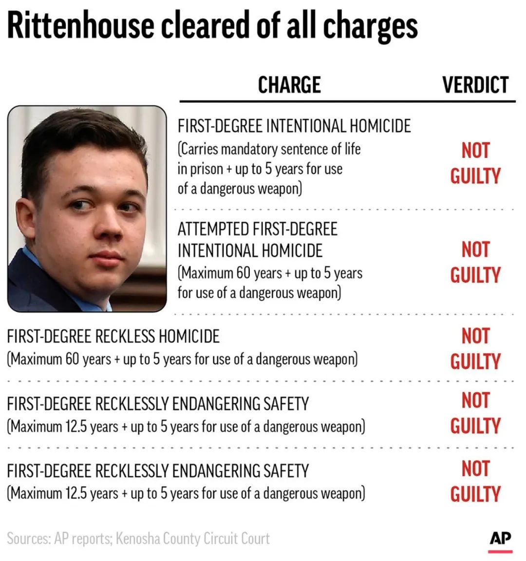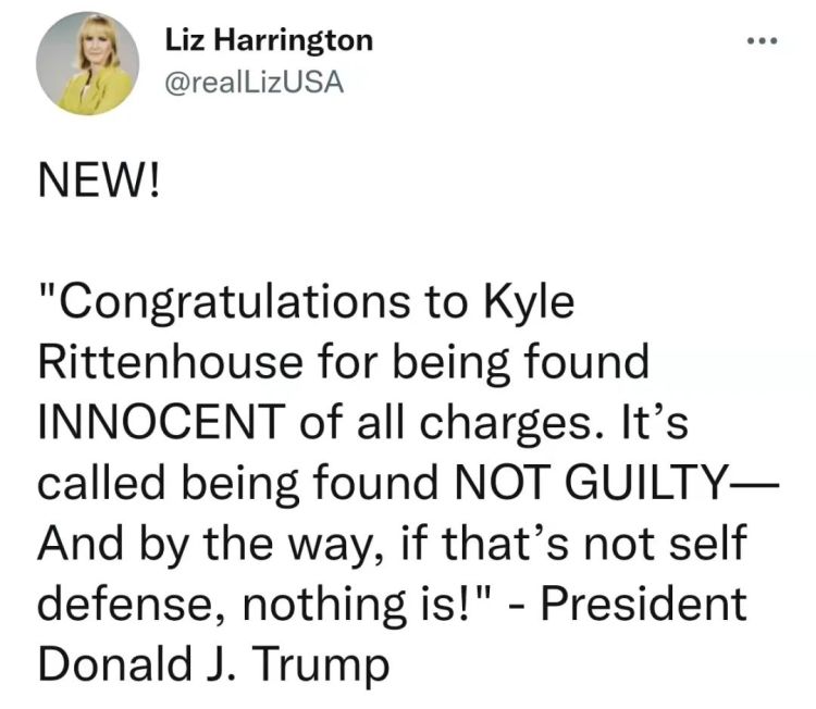 与此相反,特朗普则通过发言人莉兹·哈林顿的推特向里滕豪斯表示祝贺,“祝贺凯尔·里滕豪斯在所有指控中被判无罪释放。这叫被判无罪——顺便说一句,如果这不是自卫,那没什么算是了!”