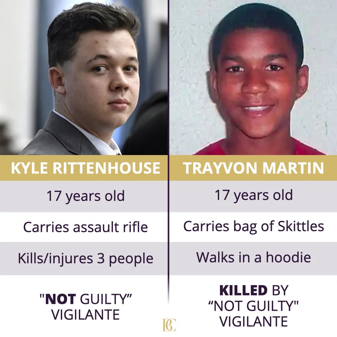里滕豪斯是否因为生为白人而被无罪释放,没有人知道。但如果里滕豪斯是一个黑人,一个黑人当街开枪杀人,他会是什么样的后果?刷屏社交媒体的一张对比图给出了答案↓↓