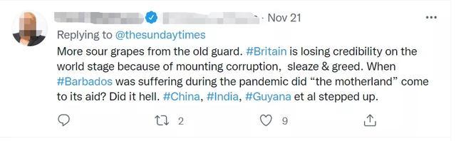 “吃不着葡萄说葡萄酸。当巴巴多斯在疫情期间遭受苦难时,“祖国”有伸出过援手吗?根本没有。反而是中国、印度、圭亚那等国挺身而出。”