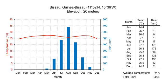 几内亚比绍总体上属热带气候,受热带辐合区(ITCZ)的影响,这是一条在赤道附近环绕地球的汇聚信风带。有两季:炎热的雨季(通常从6月持续到11月)及旱季。4月和5月是最热的月份,温度可达90华氏度(30摄氏度左右)。