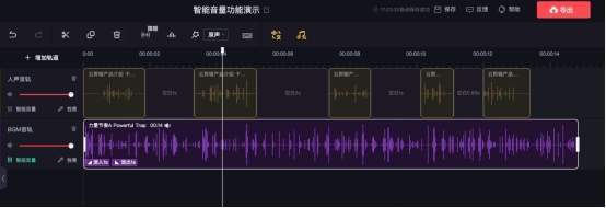 “智能音量”功能则类似于智能配乐的逻辑。AI系统通过智能算法解决了创作者、特别是播客创作者创作内容时,人声音量和背景配乐音量参差不齐的问题。智能音量功能可以让人声音量和背景配乐音量互相协调,人声进行时,背景配乐音量智能下调;人声暂歇时,背景配乐音量智能上调。