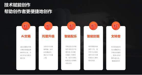 喜马拉雅通过技术和政策手段赋能创作者,目前已推出各种创作工具和功能,组成工具包,如云剪辑、AI文稿、音频转文字辅助剪辑、智能配乐、智能封面、智能音量、TTS(文字转音频)、主播打赏、播客托管升级等等。