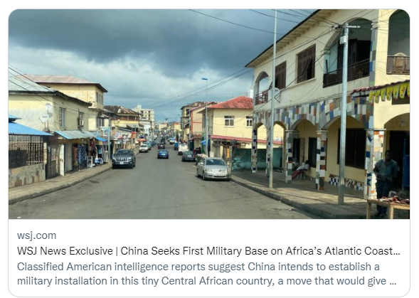 信息之三,是美国南欧特遣部队-非洲军团安德鲁•罗林少将在6月的一次采访中说:美国担心中国将在“赤道几内亚”建立一个海军基地,这将使他们在大西洋上拥有海军存在。