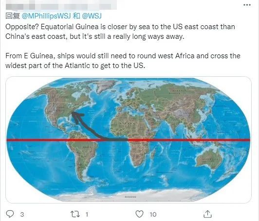 “美国的对面?从赤道几内亚出发,船只需要绕过西非、跨越整个大西洋最宽阔的地方才能到美国呢。”
