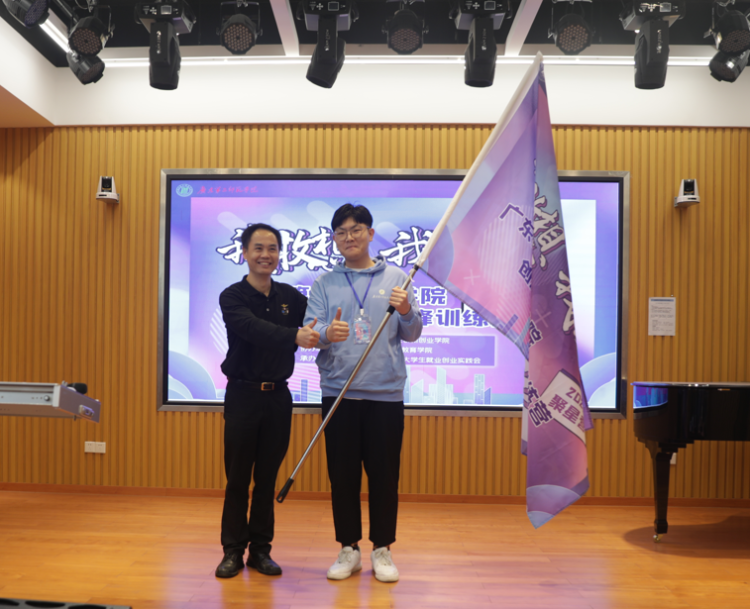 开营仪式上,黄楷胤名誉院长与学生代表王佳星共同完成训练营授旗仪式,宣布广东第二师范学院创新创业先锋训练营暨2021聚星营正式启动。