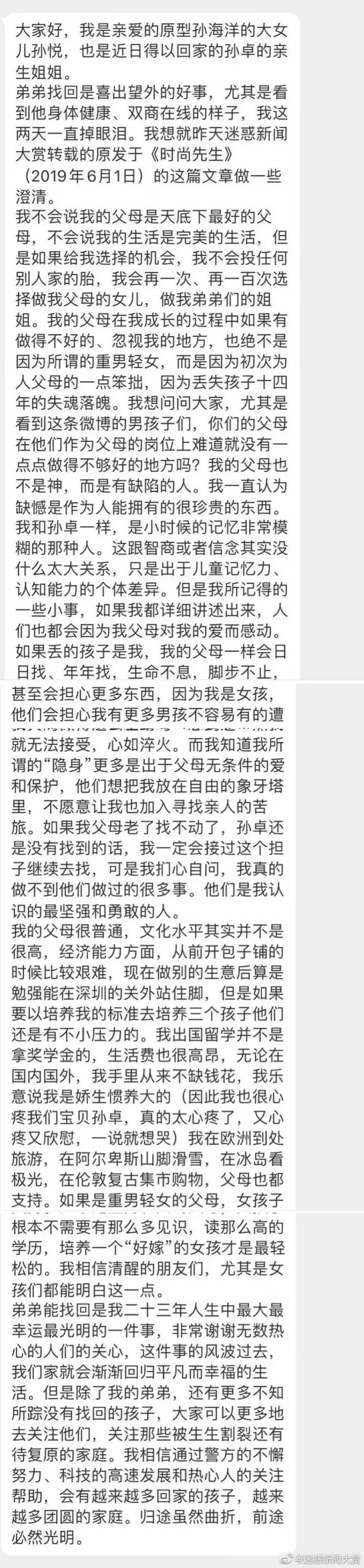 寻子14年,孙卓被找回,孙海洋认亲的催泪画面在网上流传。相关报道的片段又被截取传播。同时流传的还有一份声明:“我不会说我的父母是天底下最好的父母,不会说我的生活是完美的生活,但是如果给我选择的机会,我会再一次、再一百次选择做我父母的女儿。”声明的署名正是孙悦。