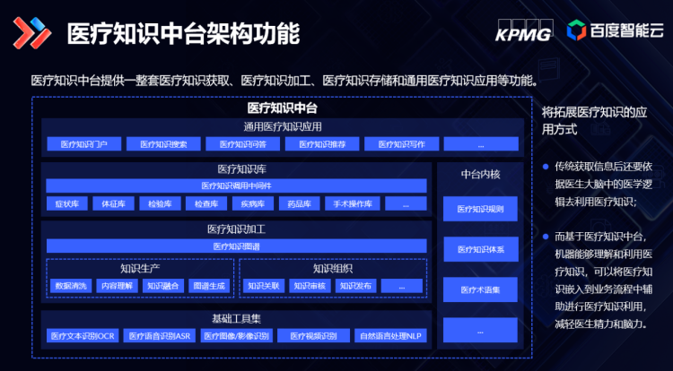 为推动知识中台在医疗领域的深入应用,百度灵医智惠联合毕马威发布了《医疗知识中台白皮书》。百度智慧医疗总经理刘军伟表示,百度持续发挥在自然语言理解、知识图谱等人工智能领域的技术优势,并且在医疗知识领域投入大量资源。医疗知识中台具备对医疗知识进行深度加工的能力,能够帮助医疗机构、医疗从业人员、医疗健康产业机构等获取权威、专业的医疗知识,满足快速搭建场景化应用的需要。白皮书的发布,意味着百度将沉淀累积的能力面向合作伙伴开放,同时也开始接受市场的检验。