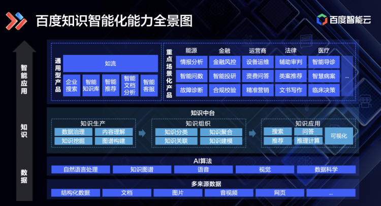 当前,全球经济形态正在由数字经济逐步发展到以人工智能为核心驱动力的智能经济新阶段,智能化成为产业转型升级的重要抓手。企业要实现智能化升级,真正需要的不仅仅是数据,更需要数据里面蕴藏的信息与知识。百度智能云以知识中台为核心,为企业打造知识智能化的智能解决方案。未来,百度智能云将携手更多合作伙伴,用人工智能技术,推进产业智能化升级!