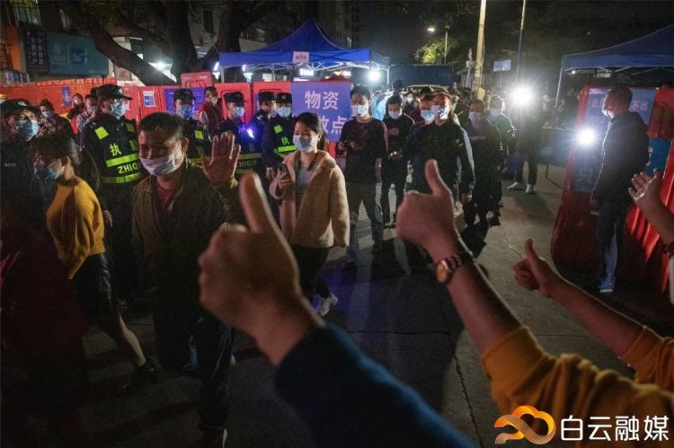 12月10日晚上7点半,第七次全员核酸检测阴性结果出来后,均禾街管控区宣布解封。等在管控区出入口的群众纷纷鼓掌庆祝,开心地走出管控区,并向工作人员致谢:“你们辛苦了,谢谢你们!”