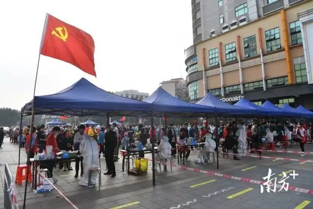 在全员核酸检测公告发布后,花都区各镇(街)党(工)委立刻发布了动员令,村(社区)党组织、综合网格党支部、网格党小组、党员责任区层层响应、迅速传达,第一时间将“请求支援”的信息传递给下沉党员。广大下沉党员积极接龙报名,不到半小时就有10000多名党员在线上集结完毕,争分夺秒奔赴全员核酸检测一线。