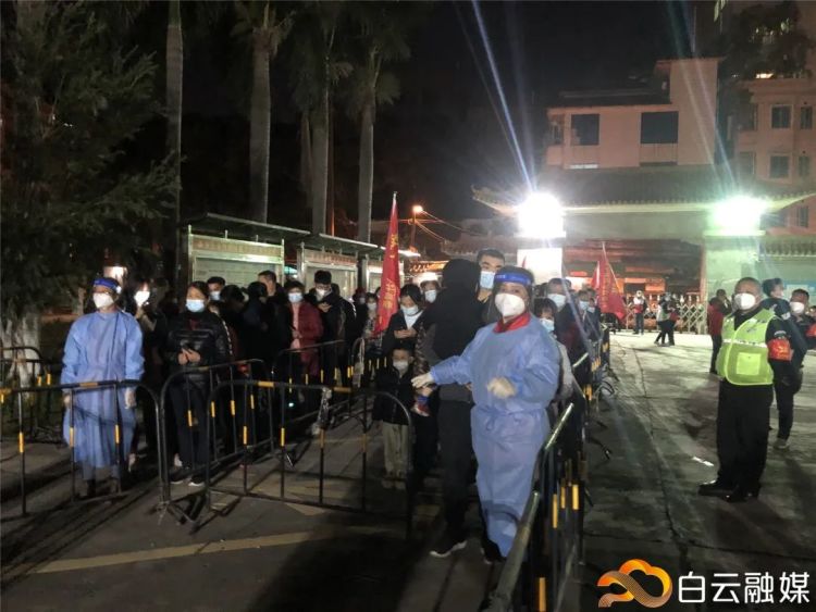 12月3日晚,白云区新市街全域、均禾文星酒店周边适度扩大区域以及其他重点场所进行全员核酸检测。 医务人员、党员干部寒夜出动,排查风险,阻隔病毒,广大市民群众积极主动配合。