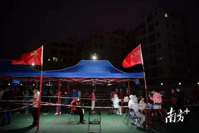 夜幕降临,花都区新华街党群服务中心检测点亮起了灯。在这里,附近莲塘村的居民正全力配合全员核酸检测。“我们通过经济社群、生产队群、出租屋群逐个给住户们发通知过来进行核酸检测,目前已发动2000多人来到党群服务中心检测点。”莲塘村村委会副主任曾瑞广说,今晚将安排村社所有干部轮班通宵值守,确保明天完成核酸检测的任务。