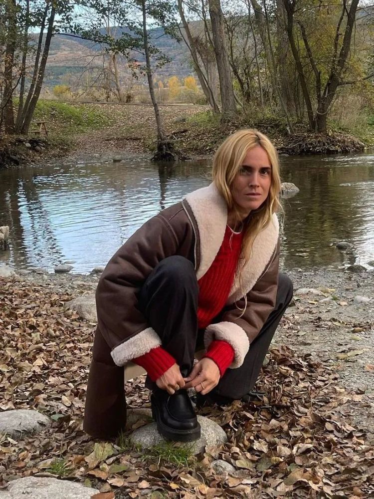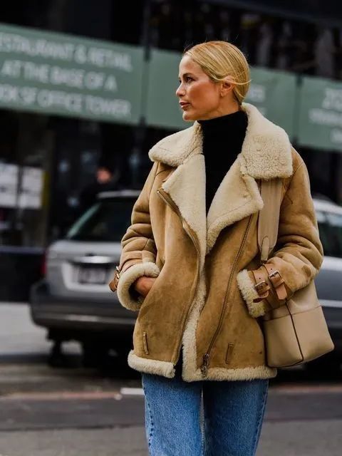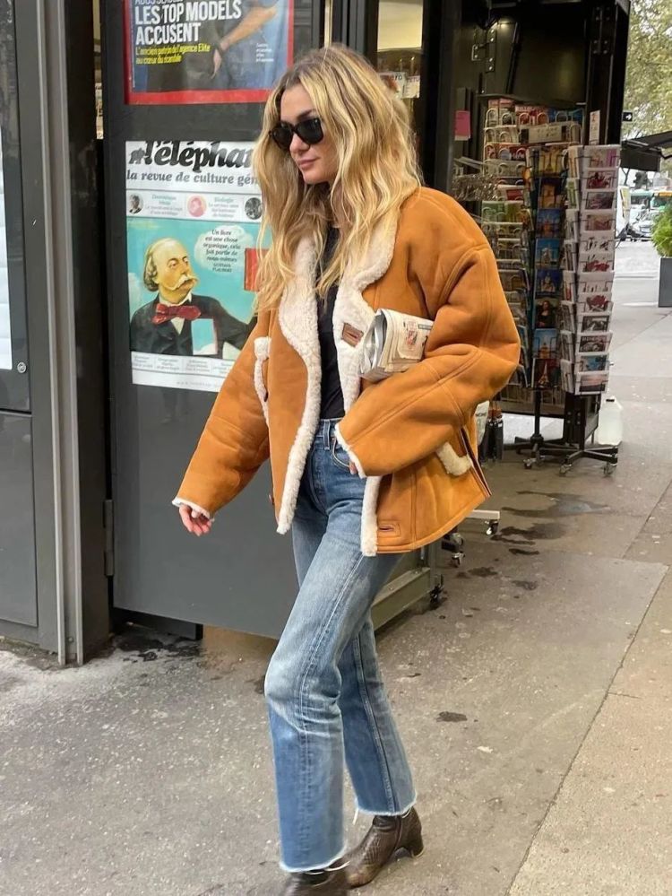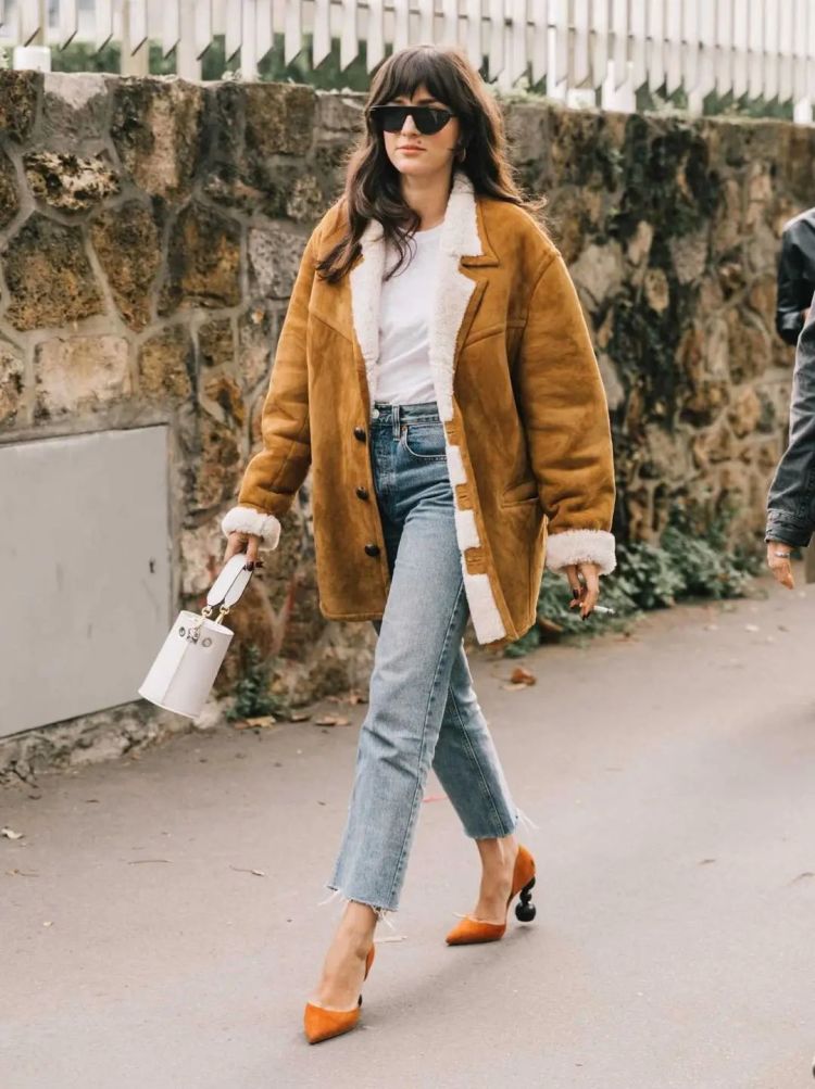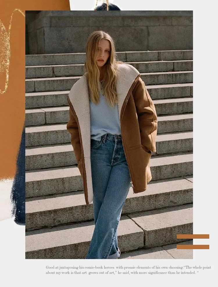 棕色的皮毛一体外套可以搭配蓝色牛仔裤,选颜色做旧一点的,会更有复古感。