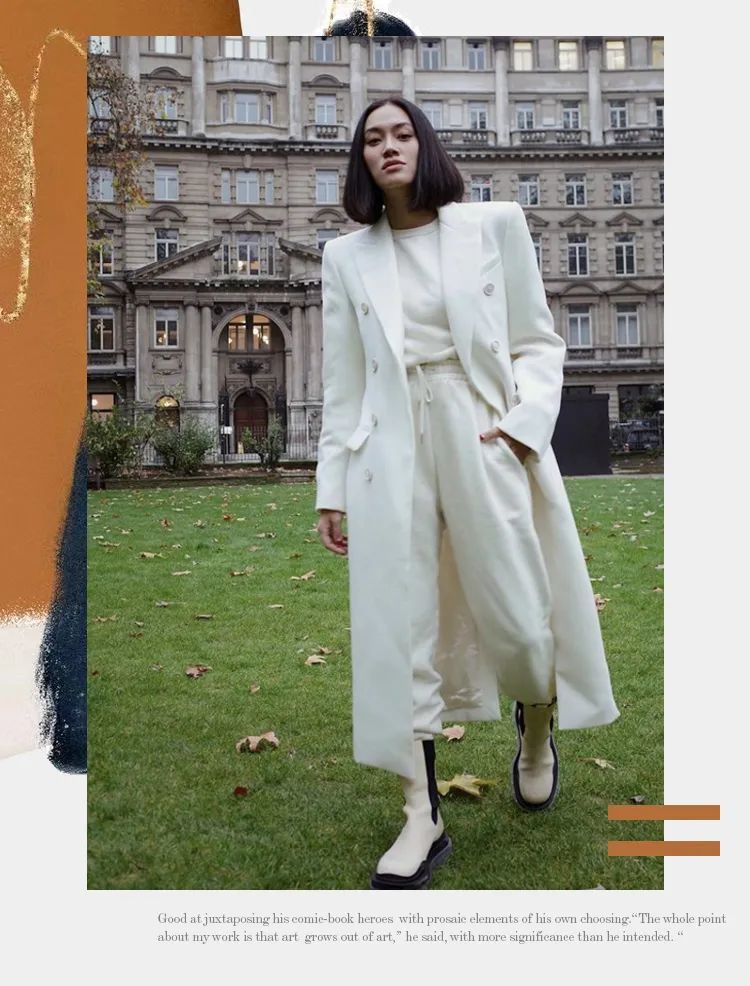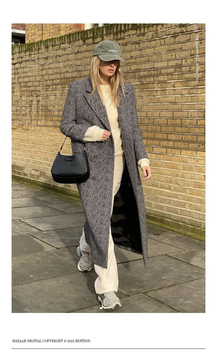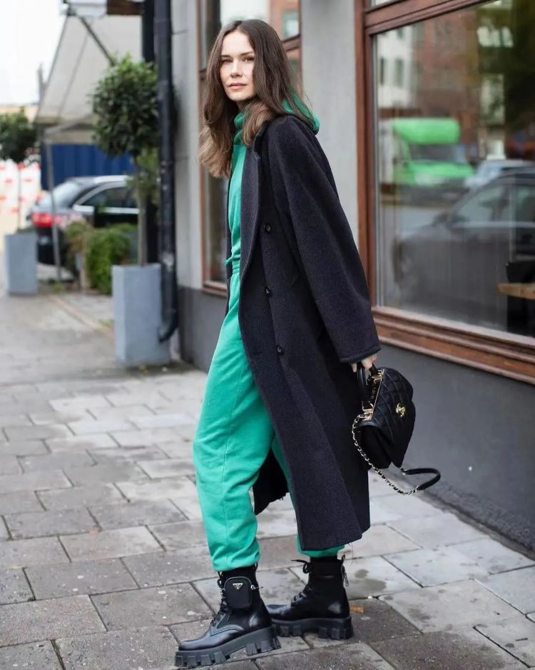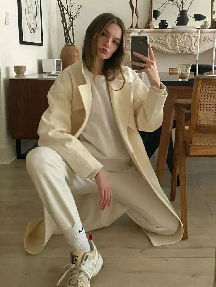 利落的长大衣可以化解卫衣套装的随意感,看起来更有精神,即使通勤上班也不会显得邋遢。
