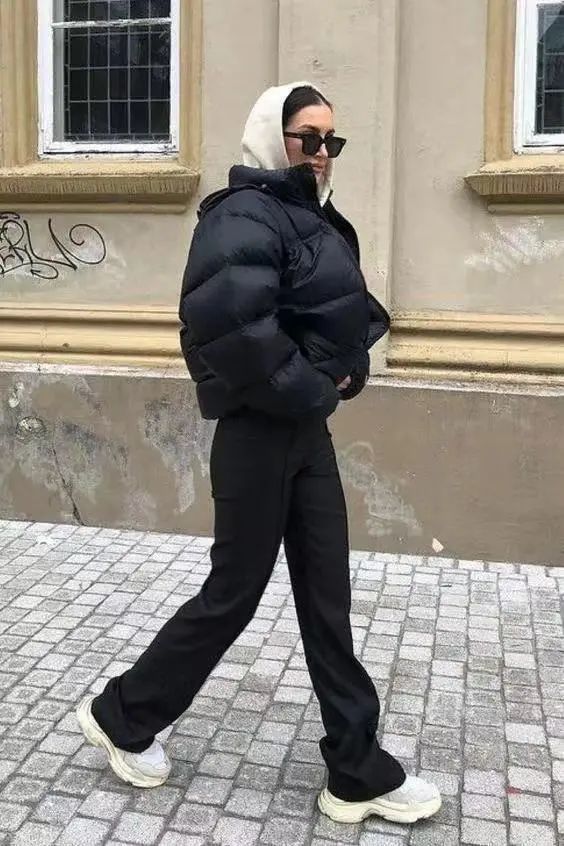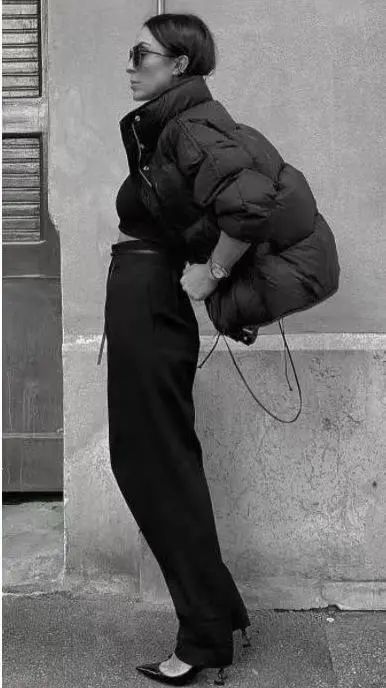 每天不想费尽心思地去考虑温度,短款羽绒服+阔腿裤的组合,既保暖又时髦,还能在里面悄悄藏一条秋裤。